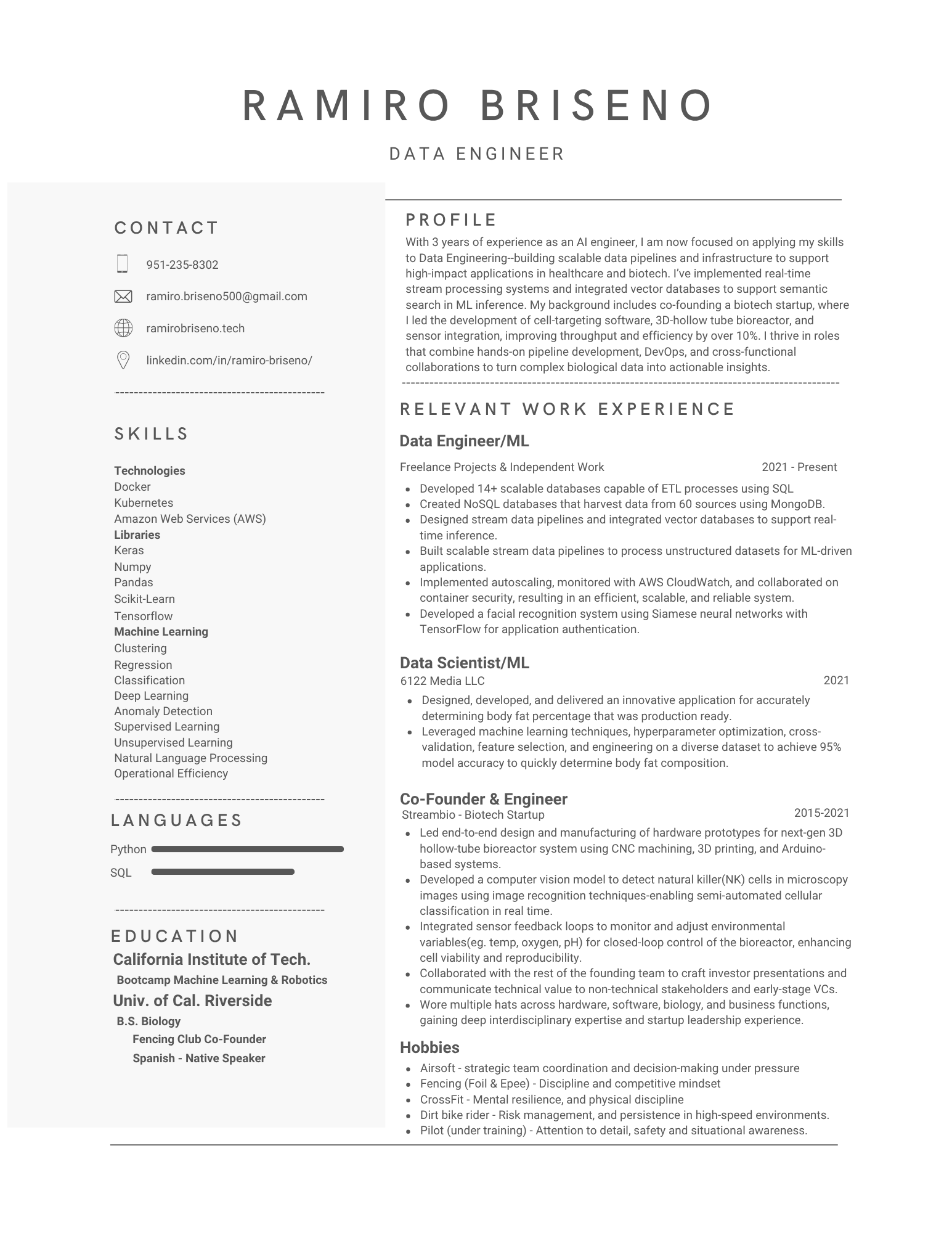 With 3 years of experience as an AI engineer, I am now focused on applying my skills to Data Engineering--building scalable data pipelines and infrastructure to support high-impact applications in healthcare and biotech. I’ve implemented real-time stream processing systems and integrated vector databases to support semantic search in ML inference. My background includes co-founding a biotech startup, where I led the development of cell-targeting software, 3D-hollow tube bioreactor, and sensor integration, improving throughput and efficiency by over 10%. I thrive in roles that combine hands-on pipeline development, DevOps, and cross-functional collaborations to turn complex biological data into actionable insights.